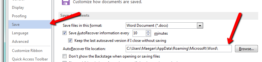 My most recent autosave didn’t take, apparently, but all is not lost. The alternative is to start by going to File-> Options -> Save, to see where your autorecover file saves to. This is typically the same for everyone but you might be different so it always helps to check.